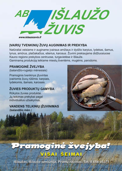 AB ,,IŠLAUŽO ŽUVIS'' pilnasistemis tvenkininės žuvininkystės ūkis, natūraliai tvenkiniuose veisiantis, auginantis ir parduodantis įvairaus amžiaus ir dydžio karpius, lydekas, šamus, lynus, amūrus, plačiakakčius, ešerius, karosus.