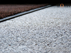 Grindys įrengtos ant nugruntuoto smėlbetonio sluoksnio. Panaudojus 2-3 mm frakcijos dažytą kvarco akmenuką ir rišiklį poliuretano pagrindu. Rankiniu būdu suformuotas lygus 6 mm storio kvarco kilimas, o esantys tarpai tarp akmenukų užpildyti akriliniu užpildu. Galutiniame etape, interjero dizaineriui pageidaujant, atliktas papildomas matinis padengimas, kuris prislopino įprastai dėl šlapio akmenuko efekto atsirandantį blizgesį.