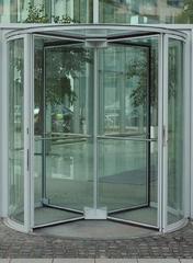 Šio modelio karuselinių durų konstrukcija leidžia tobulai įkomponuoti jas į modernų stiklinį pastato fasadą.
