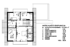 Pirmame aukšte: tambūras, dviejų mašinu garažas, katilinė, salonas, valgomasis, virtuvė, sandėliukas, darbo kambarys.