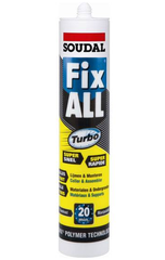 Fix All Turbo aukštos kokybės, neutralus, elastiškas, greitai klijavimo jėgą įgaunantis vienkomponentis klijuojantis hermetikas SMX - polimero pagrindu. Labai stiprios galutinės fiksacijos, gerai išspaudžiami klijai, puikiai klijuoja daugelį statybinių medžiagų, netgi kiek šlapius paviršius. Po sukietėjimo išlieka elastingi, dažomi dažais vandens pagrindu. Neblunka, atsparus atmosferiniams poveikiams ir UV spinduliams. Naudojami statybų ir metalo pramonėje lanksčiam objektų, panelių, profilių ir kitų, įprastinių paviršių klijavimui |