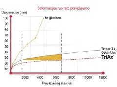 Triašis geotinklas savo efektyvumo piką pasiekia, kai užpildo sluoksnis virš jo yra apie 40cm, todėl, galima teigti, kad patiesus vieną geotinklo sluoksnį KPT SDK 07 siūlomo konstruktyvo apačioje, jo ilgaamžiškumą galima padidinti daugybę kartų - esant tam tikroms sąlygoms, polimerinio geotinklo TriAx® ilgaažiškumas siekia 100 metų (EN ISO 12224, EN ISO 13438 ir EN ISO 13438 A2 metodas, EN 14030), o atlikti bandymai parodė, kad deformacijos nuo pravažiavimų skaičiaus, lyginant nestabilizuotą ir stabilizuotą pagrindus sumažėja daugelį kartų – tai akivaizdžiai parodo rezultatai diagramoje: