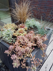 Viksvų Carex comans ‚Bronze Perfection' kupstelis ir eraičinas kompozicijoje su sukulentais.