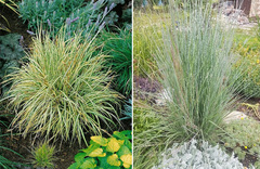 Žaliai balti dekoratyviojo ajero (Acorus variegatum) lapai ir kupstinis barzdūnas Schizachyrium scoparium 'The Blues.