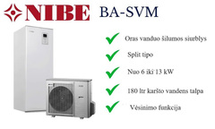 NIBE - BA-SVM 10-200. Dviejų blokų Split tipo šilumos siurblio sistema, ypač tinka individualiems namams - šildymui, ,karštam vandeniui ruošti, taip pat galimas aktyvus vėsinimas. Modelis stebina aukštais našumo rodikliais ir tyliu veikimu - vos 55 dB.