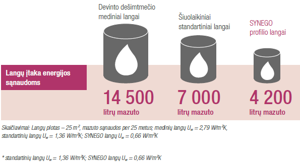 Naujieji SYNEGO langai - puikus būdas sutaupyti. Palyginus su standartiniais langais, naujieji SYNEGO langai užtikrina iki 50 % didesnę šilumos izoliaciją. Jie ženkliai sumažina šildymo išlaidas ir padidina jūsų nekilnojamojo turto vertę - šiandien, rytoj ar poryt.