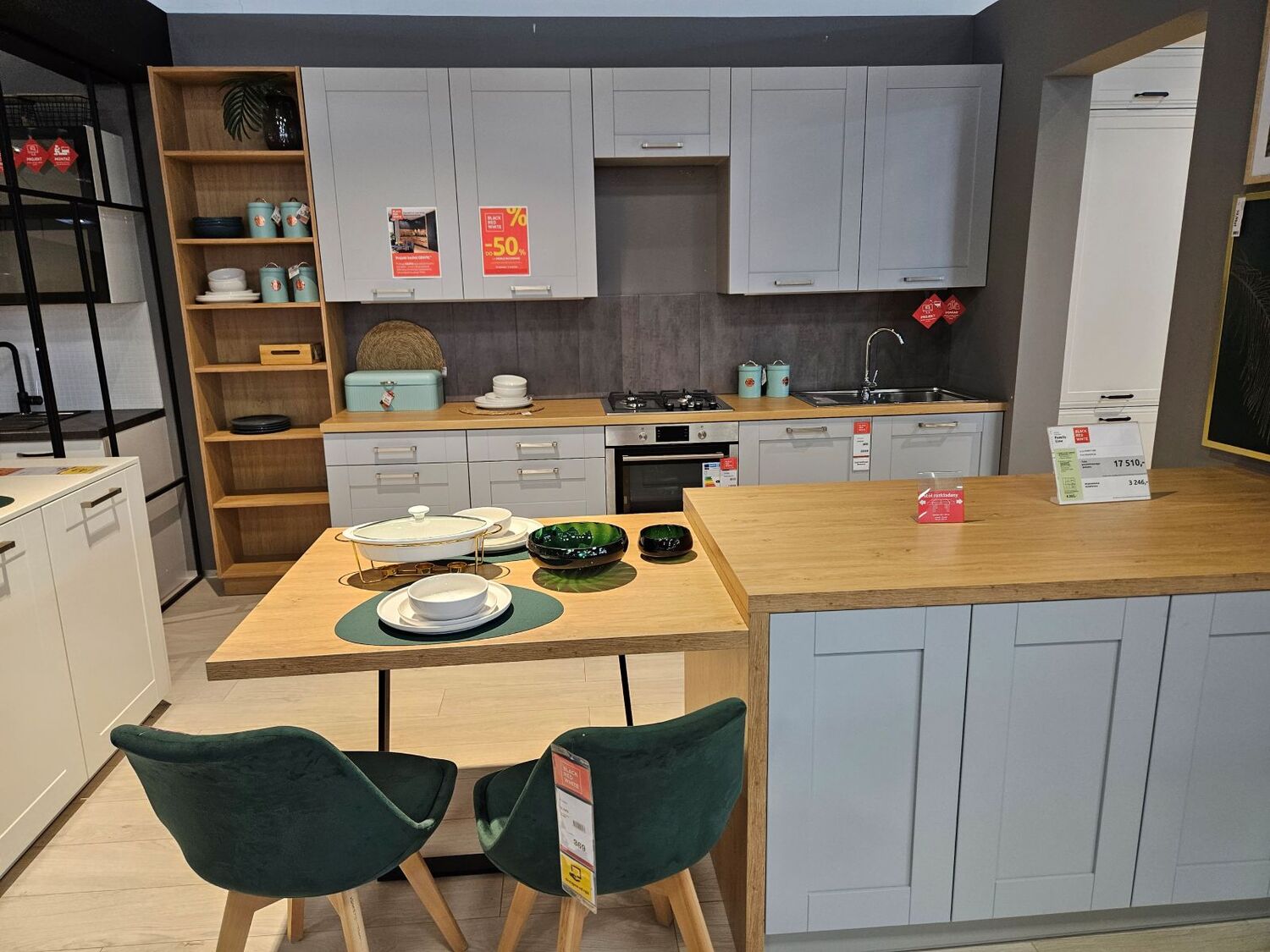 Platus spintelių rankenų asortimentas, taip pat yra kelios stalviršių medžiagos, spintelių fasadai gali būti iš stiklo.