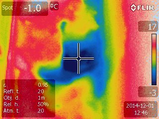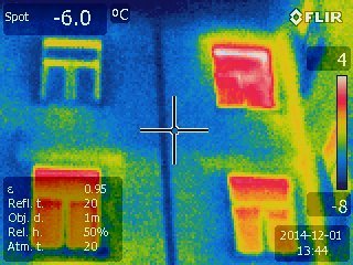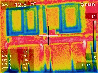 Nukreipus termovizorių į patalpos sienas, langus, duris iš karto matyti, kur yra didesnis kontrastas tarp šaltų ir šiltų zonų. Esant normaliai izoliacijai skirtumas tarp viršutinio ir apatinio rodmens neturėtų viršyti 4- 5 laipsnių. Rodemys matomi dešiniajame ekrano kampe. Skalė leidžia vertinti skirtingų vietų paviršiaus temperatūrą.