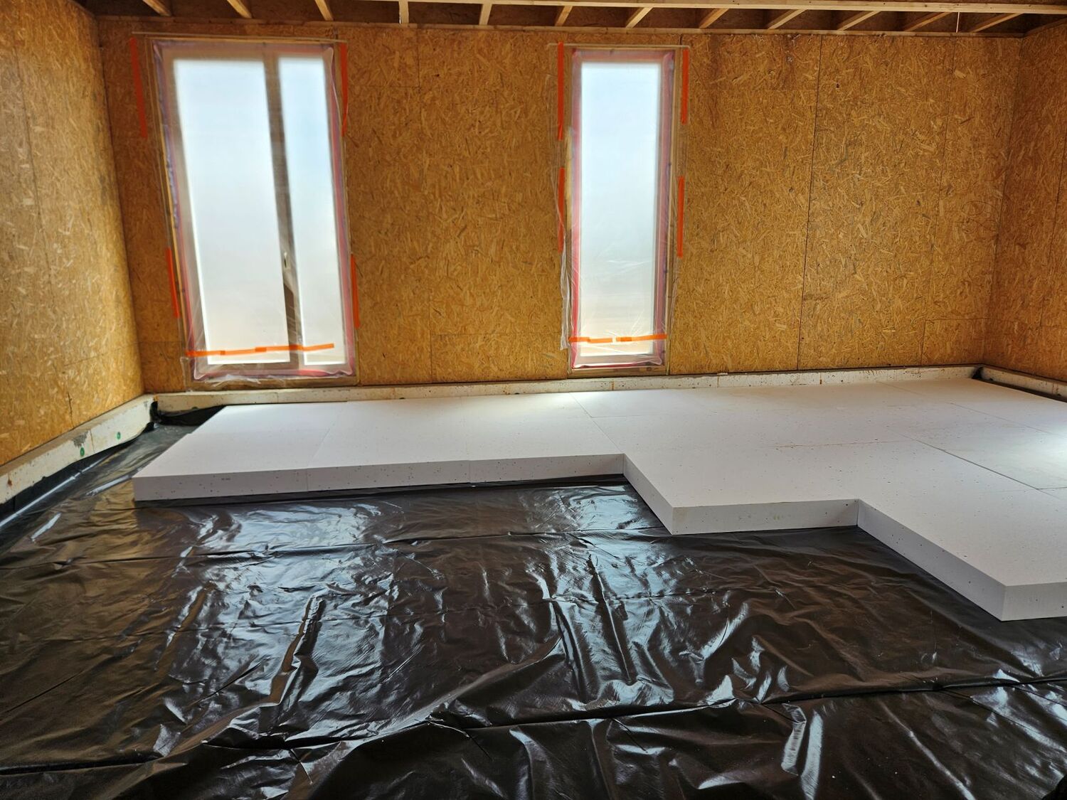 Ant išlyginto pagrindo gali būti montuojama garo izoliacija. Toliau klojamas polistireninis putplastis. Jis atlieka: