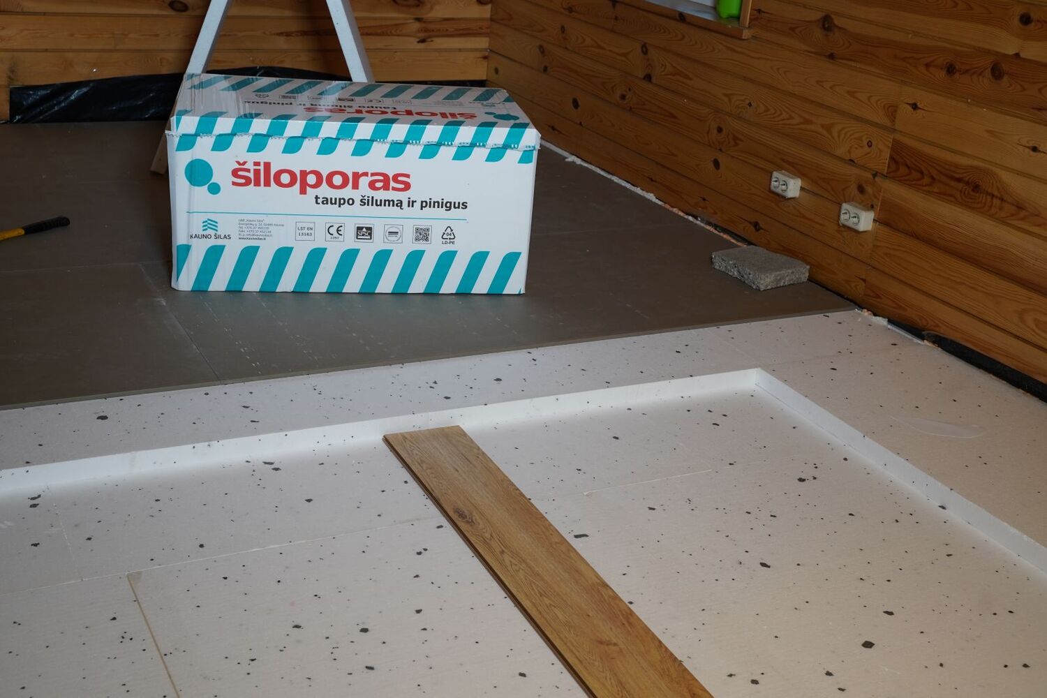 Tarp pirmojo lagų sluoksnio dedamas polistireninis putplastis (EPS 50 pakanka, nes apkrova tiesiogiai neveikia izoliacijos). Šis sluoksnis atlieka šilumos ir, jei reikia, garso izoliacijos funkciją.