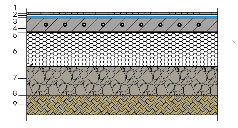Ant sukloto polistireninio putplasčio įrengiamas armuotas betono sluoksnis. Polietileno plėvelė virš EPS naudojama tik tada, kai grindų konstrukcija projektuojama kaip plaukiojanti arba kai reikia suformuoti sandarų garo barjerą. Jeigu projektas to nenumato, betonas gali būti liejamas tiesiai ant izoliacijos.